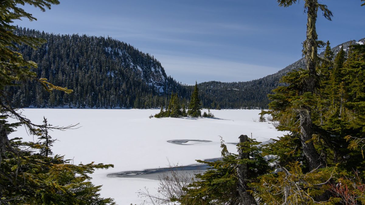 In brief –it is only the start of April, and we are in that in-between stage when the compacted snow on the Plateau trails is crisp and icy in the morning, soft and soggy in the afternoon. The photo above of Lake Helen MacKenzie shows open ice at the Piggott Creek outflow and very little snow on the Saddle between Mt Elma and Mt Allan Brooks. Spring skiing is all but over, and we could see the trails on the Plateau clearing by early May, as double-digit temperatures are forecast for the end of the week. The dribs and drabs of snow that have fallen on the Plateau over the past couple of weeks have not really contributed to the remaining snow pack of less than a metre in Paradise Meadows.