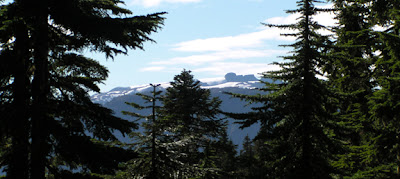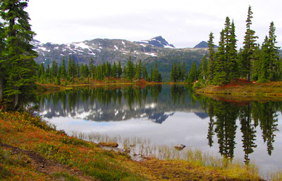 Today the sky was not as blue, but the water was totally calm. This time I tried composing with the rock centred between the peaks of Mt. Albert Edward & Mt. Regan.