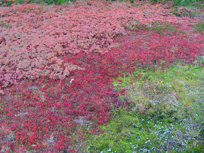 Back in the meadows near the trailhead, the dark red leaves against the green moss are dwarf blueberry, while the carpets of paler red are bog blueberry.