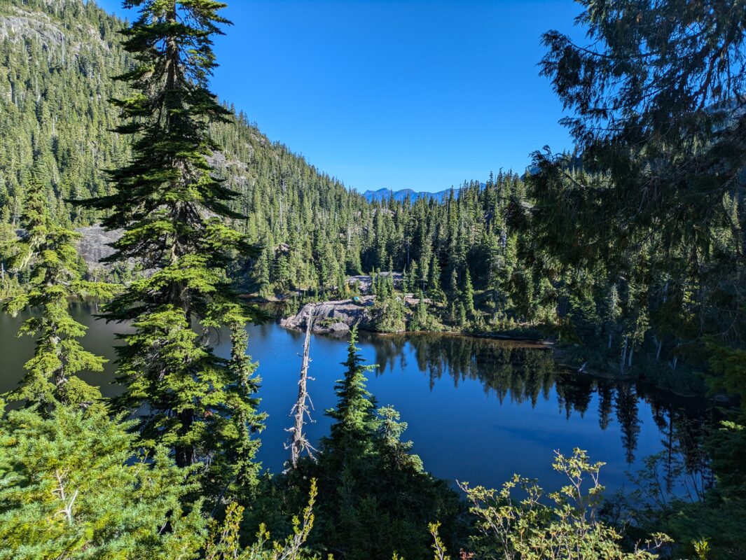 Once past the summit of Phillips ridge the trail works it’s way down to Carter Lake. The trail leaves the ridgeline at Carter Col (a separating point between the route that connects to Marble Meadows) and steeply descends back into the forest. Next up are two larger lakes that the trail navigates around, Carter Lake and Schjelderup Lake. Both have good camping options. Finally there is one last ascent to reach the Burman Lake ridgeline. Summit attempts can be made from Schjelderup Lake (North) but camping further along the trail closer to Burman Lake is most common.