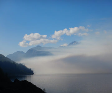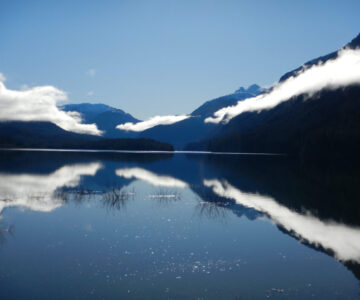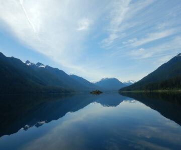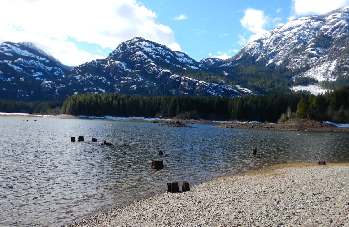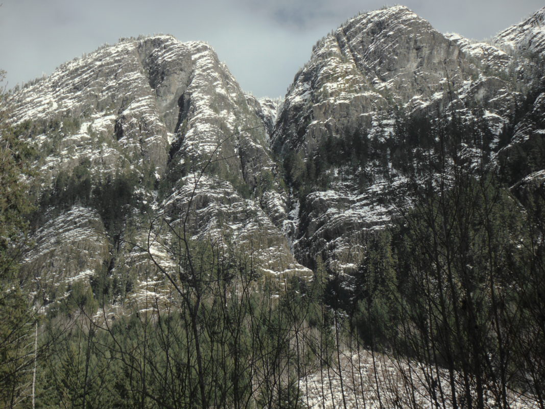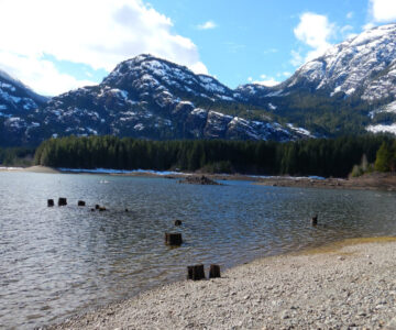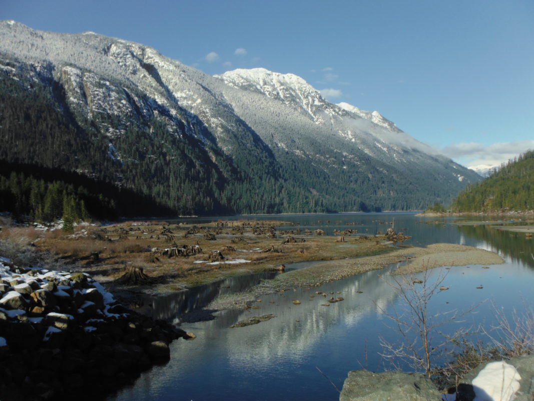 The beauty of Buttle Lake and the mountains that border it in Strathcona Provincial Park, BC can be readily appreciated anytime of the year by driving the paved Westmin Road on the east side of Buttle Lake that extends from the bridge at the upper end of Buttle Lake to the bridge at the lower end of Buttle Lake and Lower Myra Falls. En-route, there are rest stops to picnic as well as scenic pullouts with markers that identify many of the mountains. Check out pictures of the drive in both fall and winter below, and make sure to enjoy the views in person.
