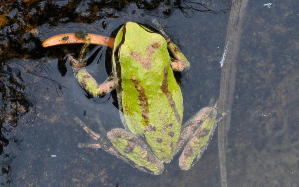 Tim Penney captured this quite unique photo of a tiny Pacific Chorus Frog with lunch lined up on its tongue, seemingly holding it steady with its middle front toe.