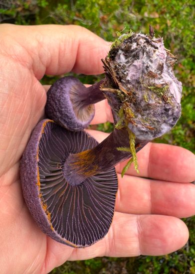 The occasional mushroom has emerged – but few and far between. A week ago Saturday a small cluster of the striking Cortinarius violaceus was found on the north-facing shaded slope above the large Pond in the Meadows – a typically wet spot, which is always the last to lose snow in spring.