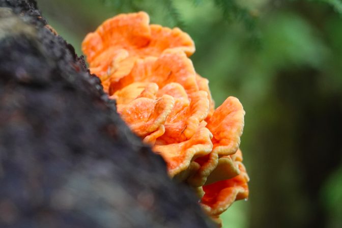 The workshop was already full by the beginning of September, with a waiting list. This year our team of talented experts included Andy MacKinnon, Shannon Berch, Thom O’Dell and Erin Feldman, all eminent mycologists with extensive experience in both instruction and guiding field forays. On Saturday we had in-class slide presentations and ID sessions, combined with forays out into the Meadows, in both morning and afternoon, separated by a lunch featuring wild mushroom soup. On the Sunday SWI Director Loys Maingon led a hike through the fungus-rich forested north facing slopes of Mt Allan Brooks on the trail to Divers Lake, which lies in the valley below and to the west of Paradise Meadows. The moist valley in which Rossiters and Divers Lake lie proved more productive mycologically that the Paradise Meadows area yet again – e.g. the colourful “chicken of the woods” mushroom below.